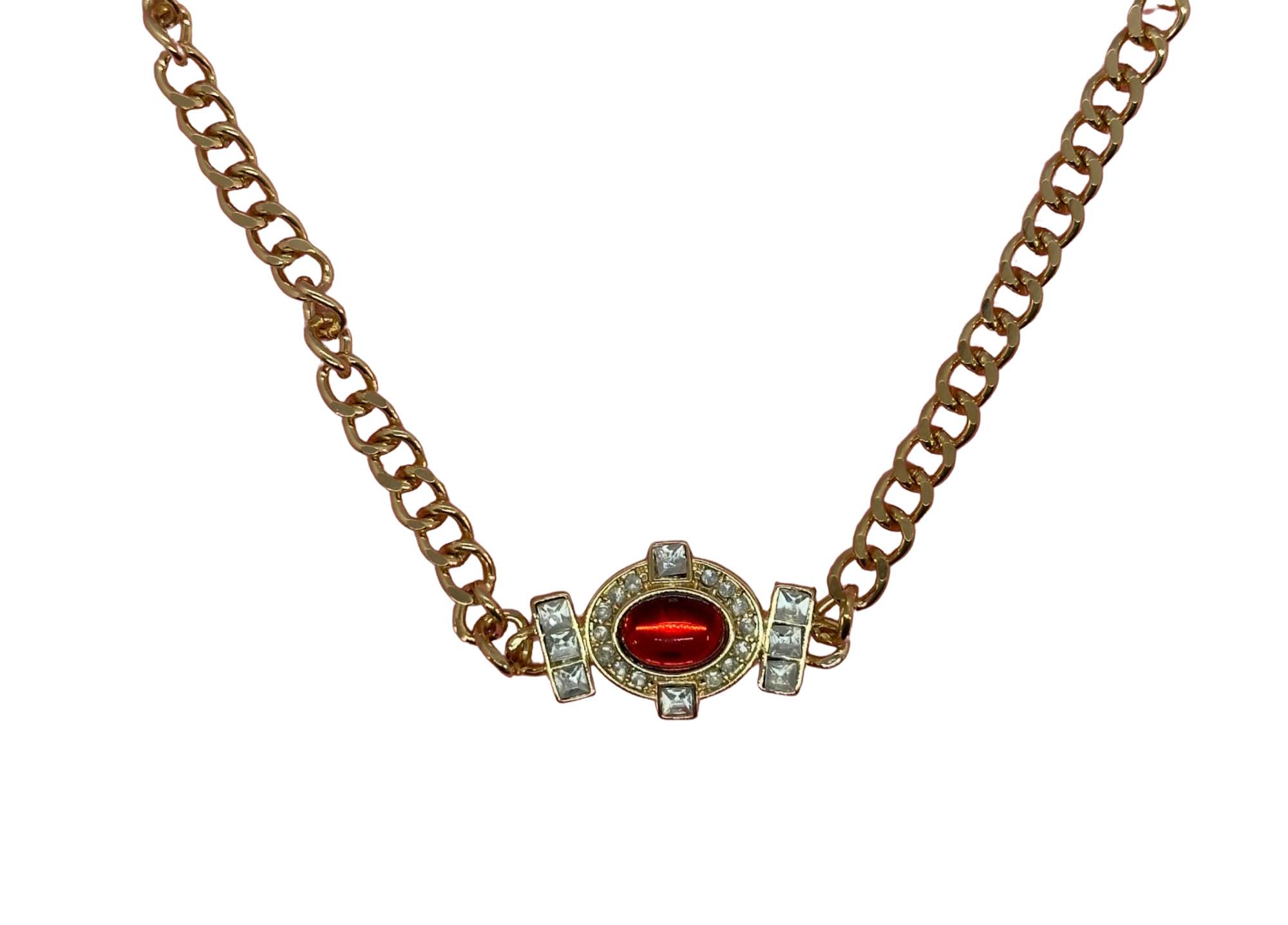 Vintage-style necklace features a central faux ruby cabochon surrounded by clear rhinestones, set in a heavy gold-plated curb link chain